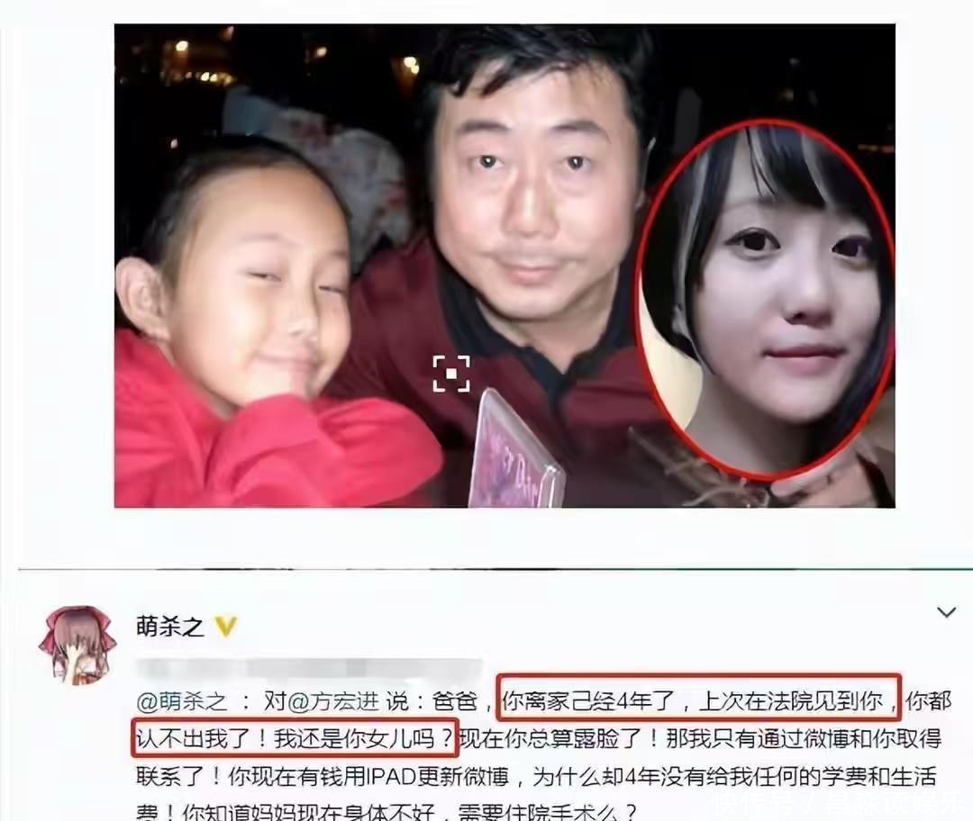012011年,方宏进的女儿在微博上控诉自己的亲生父亲。在文中她表示父亲抛妻弃女,不给她生活费和学费。不仅如此,方宏进还家暴妻子,自己的微博曾经也被父亲拉黑。网友们看到之后难以置信,方宏进可是前央视主持人,怎么可能做出这种事情?